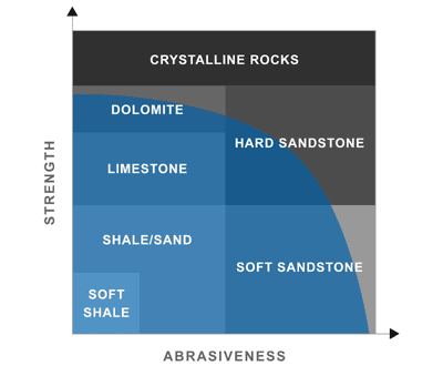 Today’s PDCs are effective in shale, limestone, and sandstone formations. Over time, the PDC-drillable zone will continue to grow and expand (see figure). For example, US Synthetic frequently cuts crystalline rocks for extended periods in a laboratory environment—and is working hard to extend these capabilities to an operating environment.